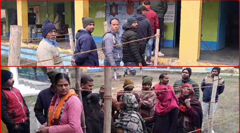 कोटद्वार नगर निगम के अंतर्गत घमंडपुर केंद्र में लगी मतदाताओं की कतार